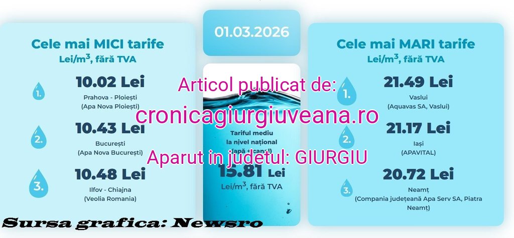 • Tarifele pentru serviciile de alimentare cu apă și canalizare continuă să fie extrem de variate în România, iar diferențele dintre regiuni se mențin la începutul anului 2026, potrivit datelor oficiale publicate de Autoritatea Națională de Reglementare pentru Serviciile Comunitare de Utilități Publice (ANRSC). Documentele centralizează tarifele aprobate pentru operatorii regionali și arată că costurile sunt influențate de nivelul investițiilor, eficiența rețelelor locale și condițiile specifice fiecărei zone. În practică, locuitorii din anumite județe achită aproape dublu față de cei din alte regiuni.• La nivel național, tarifele cumulate pentru apă potabilă și canalizare, fără TVA, variază semnificativ. În nord-est și estul țării, tarifele depășesc frecvent 21 lei/mc, în timp ce în vest și sud-vest, prețurile sunt sub 12 lei/mc.Bucureștiul și județul Ilfov, alături de orașe precum Sibiu sau Orăștie, se numără printre zonele cu cele mai accesibile tarife. De exemplu, clienții Apa Nova Ploiești plătesc 10,02 lei/mc, cei ai Apa Nova București – 10,43 lei/mc, iar locuitorii deserviți de Veolia Chiajna achită 10,48 lei/mc.Județe precum Vaslui și Neamț înregistrează tarife cumulate pentru apă și canalizare printre cele mai mari din țară, depășind 20 lei/mc fără TVA.Pentru consumatorii casnici, această diferență se traduce prin costuri aproape duble față de locuitorii din zonele cu tarife reduse.• De ce diferă atât de mult tarifele la apă și canalizareConform sursei, tarifele diferă din cauza mai multor factori: dimensiunea și eficiența rețelelor, nivelul investițiilor realizate la nivel local, condițiile geografice și tehnice ale sistemelor, dar și structura operatorilor regionali și costurile de exploatare. Localitățile cu rețele modernizate sau mai compacte practică tarife mai mici, în timp ce zonele cu infrastructură veche sau extinsă înregistrează costuri mai ridicate.Conform evidenţelor ANRSC valabile la 1 februarie 2026, tariful mediu la nivel naţional pentru apă şi canalizare este de 15,81 lei/mc, fără TVA.La Giurgiu tariful pentru apă şi canalizare este de 18.5 lei, fără TVA.Sursa: Evz.roClasament complet (lei/mc, fără TVA) – martie 20261. AQUAVAS Vaslui — 21,492. APAVITAL Iași — 21,173. APA SERV Neamț — 20,724. APA Târnavei Mari Mediaș — 20,315. APA Târgoviște Dâmbovița — 20,246. APA Arieș Turda — 20,037. APA Bacău — 19,658. APA Oltenia Craiova — 18,649. APA SERVICE Giurgiu — 18,6010. HIDRO PRAHOVA — 18,5111. ACET Suceava — 18,4012. APA Serv Alexandria — 18,1413. CUP Focșani — 17,9114. APA Canal Galați — 17,3015. APA Alba — 17,2516. COMPANIA APĂ ARAD — 17,1917. APA-CANAL Ilfov — 17,1018. RAJA Constanța — 17,0819. VITAL Baia Mare — 17,0620. AQUABIS Bistrița — 16,9221. AQUASERV Târgu Mureș — 16,8822. COMPANIA DE APĂ BUZĂU — 16,7423. APA CANAL 2000 Pitești — 16,4424. NOVA APASERV Botoșani — 16,4025. APAREGIO Gorj — 16,3826. CUP Dunărea Brăila — 16,1027. ECOAQUA Călărași — 15,6728. AQUATIM Timișoara — 15,5729. APA BRAȘOV — 15,3430. URBAN Slobozia — 15,1531. AQUASERV Tulcea — 14,9932. APA SERV Valea Jiului — 14,9333. COMPANIA OLT — 14,9334. HYDROKOV — 14,7235. APA SERV Satu Mare — 14,6936. APA PROD Deva — 14,6937. SOMEȘ Cluj — 14,5938. SECOM Drobeta — 14,4839. APAVIL Vâlcea — 14,1940. AQUACARAȘ Reșița — 13,9541. ORADEA — 13,5642. EURO APAVOL Voluntari — 12,9143. APA NORD VEST — 12,2144. APA CANAL Sibiu — 12,1045. GOSCOM Orăștie — 11,4646. HARVIZ — 11,4347. AQUATORONTAL — 11,36Sursa : ANRSCÎntr-un grupaj viitor vom arăta, în amănunt, care sunt cheltuielile lunare ale Apa Service cu rețeaua de canalizare, îndeosebi cu Stația de epurare de la Giurgiu.