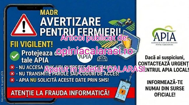 Ministerul Agriculturii și Dezvoltării Rurale (MADR) îi avertizează pe fermieri și pe toți beneficiarii plăților gestionate de APIA să manifeste maximă prudență în privința mesajelor primite pe telefon sau online, care pot urmări obținerea ilegală a datelor de acces în conturile personale.
