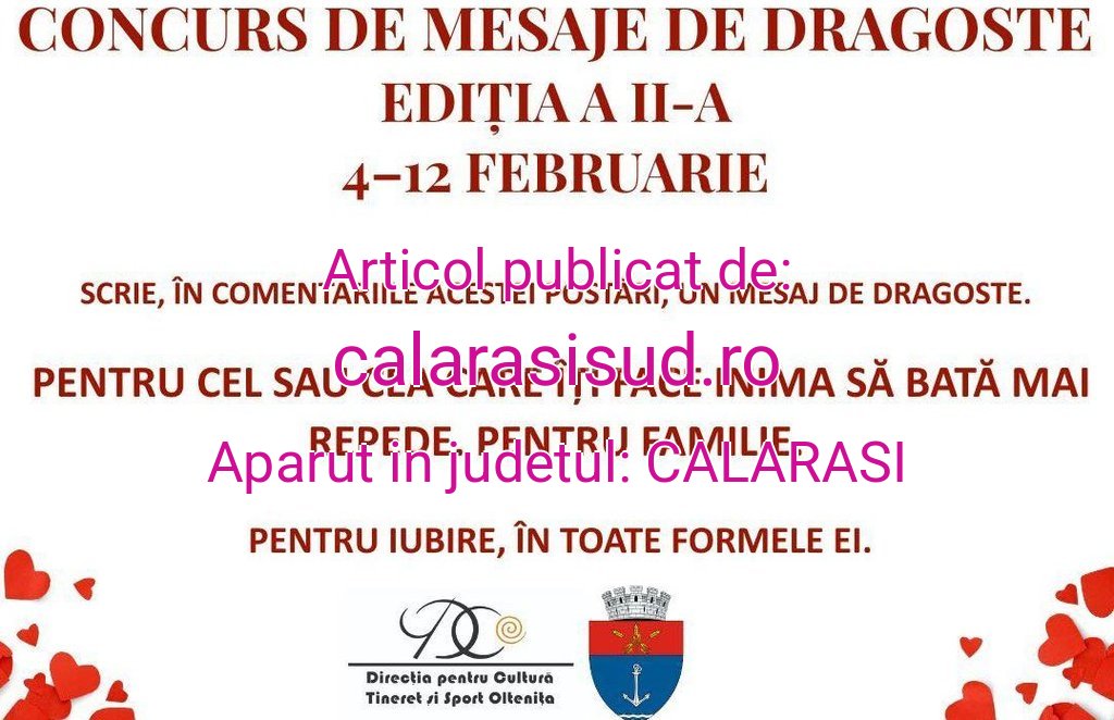 Direcția pentru Cultură, Tineret și Sport, în parteneriat cu Primăria municipiului Oltenița, derulează ediția a II-a a concursului de mesaje de dragoste, în cadrul evenimentului reprezentat de „Ziua Îndrăgostiților” – 14 Februarie.